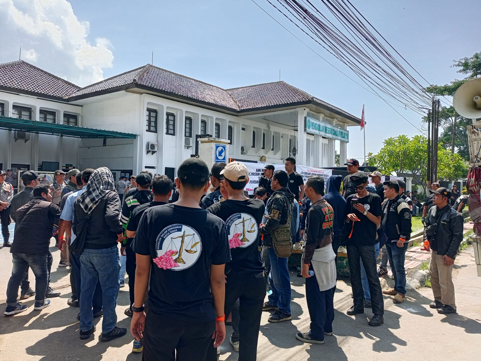 Massa membawa spanduk bertuliskan “Tegakan Keadilan Basmi Syetan Tanah” dan menyerahkan secara simbolis kepada perwakilan PN Cianjur.