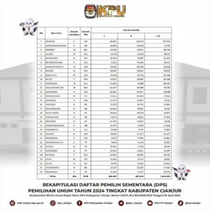 Jumlah DPS tersebut tertuang dalam berita acara KPU Cianjur Nomor 213/PL.01.2-BA/3203/2023 tentang Rekapitulasi Daftar Pemilih Sementara (DPS) Tingkat Kabupaten Cianjur Pemilihan Umum Tahun 2024.