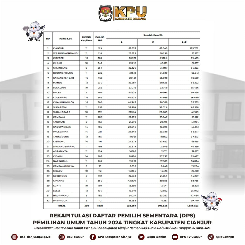 Ketua KPU Kabupaten Cianjur, Selly Nurdinah, menjelaskan, DPS Kabupaten Cianjur untuk Pemilu 2024 sendiri ada sebanyak 1.846.503 pemilih yang terdiri 938.667 pemilih laki-laki, dan 907.836 pemilih perempuan. Sementara untuk jumlah TPS ada sebanyak 7.278 TPS, di 32 kecamatan, 360 desa/kelurahan di Cianjur.
