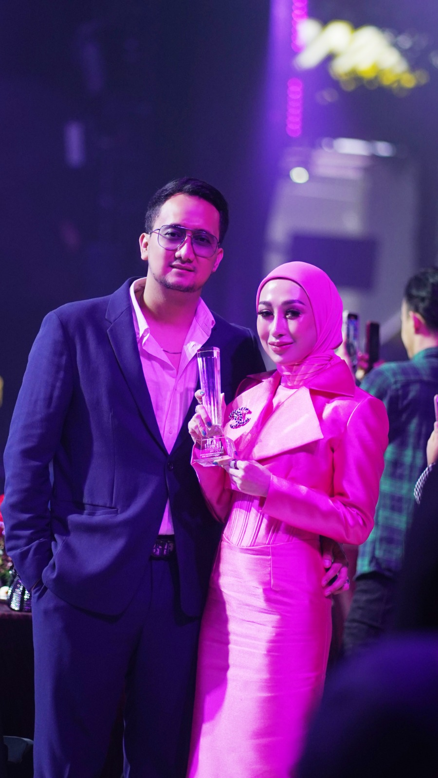 Dalam foto tersebut terlihat dr. Reza Gladys yang merupakan owner perusahaan Klinik Kecantikan Glafidsya, mengangkat piala penghargaan sebagai pemenang nominasi.