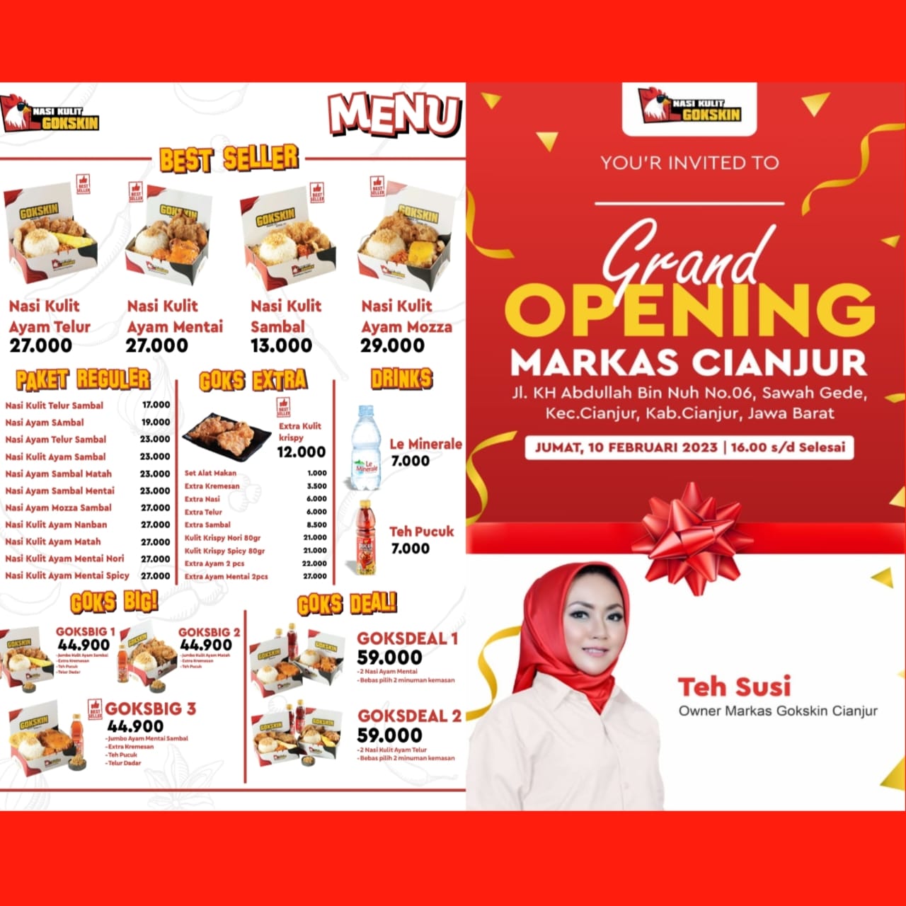 Grand Opening Nasi Kulit Gokskin Cabang Cianjur ini di laksanakan hari Jumat, 10 Februari 2023.