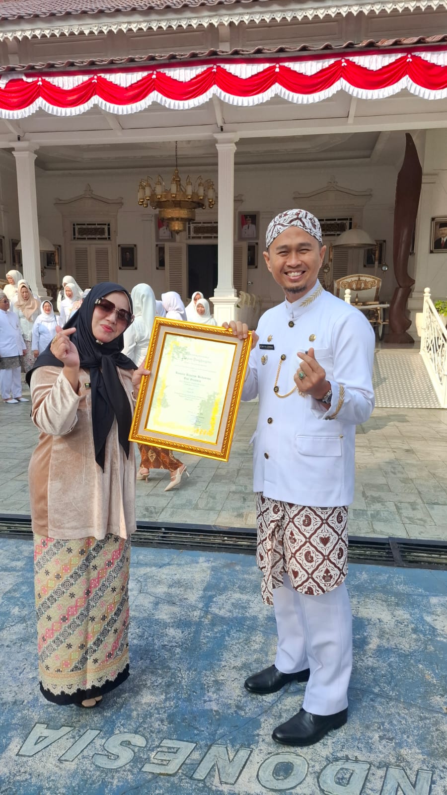 Kades Mulyasari Dewi Susanti berkesempatan langsung menerima piagam penghargaan dari Bupati Cianjur Mohammad Wahyu Ferdian di halaman eks Parkir Pendopo Pancaniti.