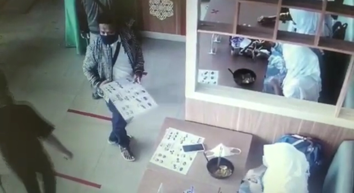 Kejadian itu pun terekam kamera pengawas. Dalam video yang berdurasi 02.08 menit itu terlihat seorang pria yang diduga pelaku pencurian berdiri tepat di depan meja tempat korban menikmati ramen.