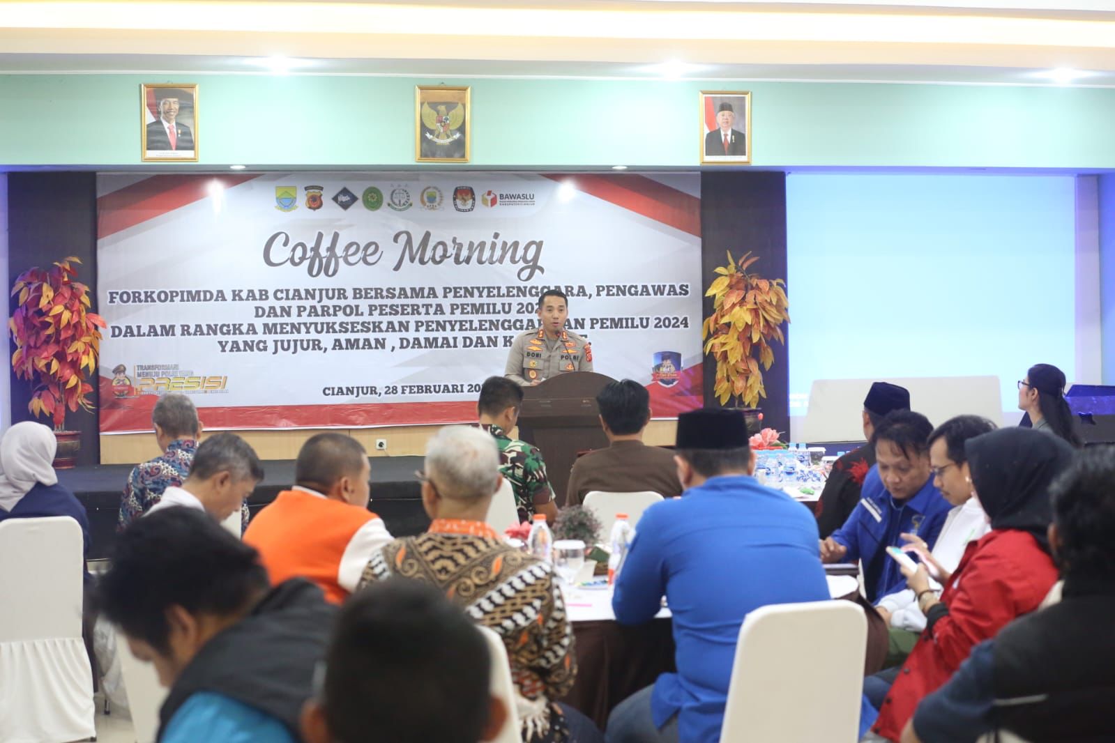 BESINFO.COM, Cianjur – Polres Cianjur bersama Forkopimda Kabupaten Cianjur, Penyelenggara, Pengawas, dan Partai Politik Peserta 2024 mengikuti kegiatan Coffe Morning yang digelar di Ballroom Hotel Grand Bydiel Cianjur dalam rangka menyukseskan penyelenggaraan Pemilu 2024 yang jujur, aman, damai dan kondusif. Selasa (28/02/2023).