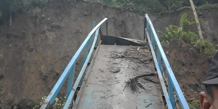 “Jembatan ambruk Kamis (23/12) sekitar pukul 13.00 WIB akibat luapan sungai Cimaragang setelah diguyur hujan deras,” ujar Kepala Desa Gelarpawitan, Heri Kuswanto.