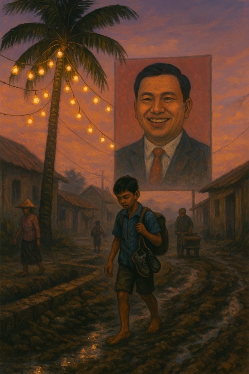 Pohon kelapa, dulunya ditanam untuk kehidupan. Airnya segar, daunnya teduh, batangnya kokoh. Kini ia jadi gantungan dekorasi, tanpa fungsi, hanya simbol. Seperti kekuasaan yang lupa akar. Sementara itu, di pelosok-pelosok Cianjur, sekolah rusak masih berdiri seperti kandang ayam. Menurut data Dinas Pendidikan, ada lebih dari 150 ruang kelas dasar yang butuh perbaikan mendesak. Anak-anak melewati jalan lumpur ke sekolah, sepatunya digantung di leher agar tidak basah. Tetapi dari pusat kota, Cianjur tampak indah, selama kamera tidak diarahkan ke tanah.